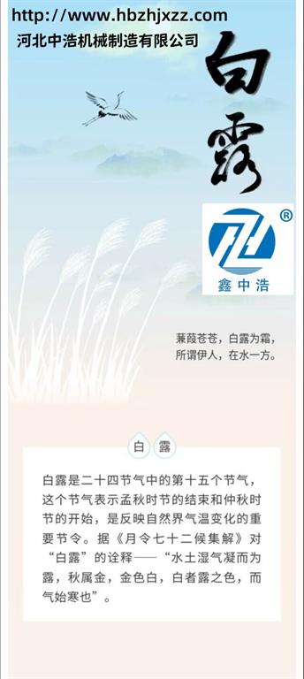 白露時節,鄭國各地大忙時節,一些地區開始收獲谷子、高粱和大豆,一些地開始采摘新棉,西北地區則開始播種冬小麥。而河北中浩依然從事波紋補償器、膨脹節、通風蝶閥、管道連接的制造,專注工藝,創新設計,不斷為客戶提供合適產品而不懈努力和奮斗。